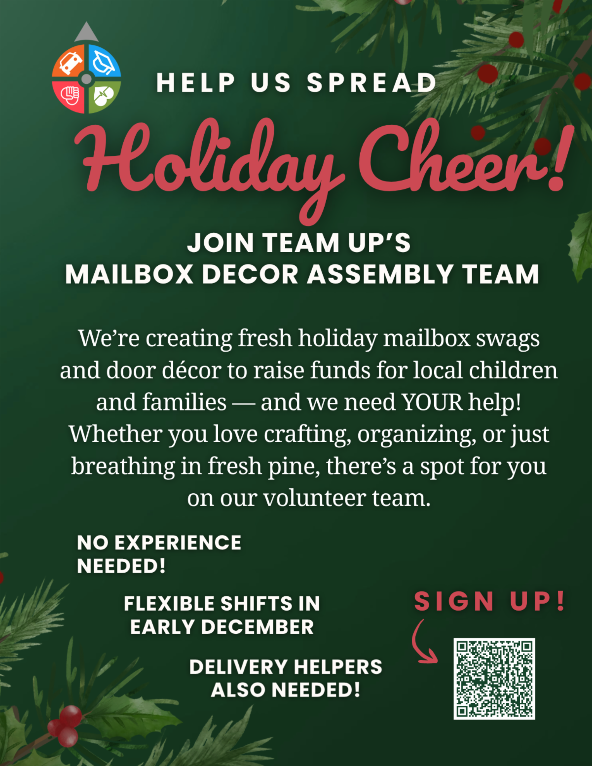 Team Up Mentoring is selling beautiful, handmade mailbox swags and door décor for the holidays. Made from fresh greenery donated by a local tree farm! All proceeds support youth and families in Walton County. Order yours today: www.teamupmentoring.org/swag.